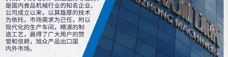 廣州旭眾食品機械有限公司是一家集科研開發(fā),生產(chǎn)設(shè)計,營銷服務(wù)為一體的現(xiàn)代化生產(chǎn)企業(yè)?,F(xiàn)代化生產(chǎn)車間,精湛制造技術(shù),所產(chǎn)機械歷經(jīng)市場重重考驗,不斷贏得海內(nèi)外客戶的贊譽。